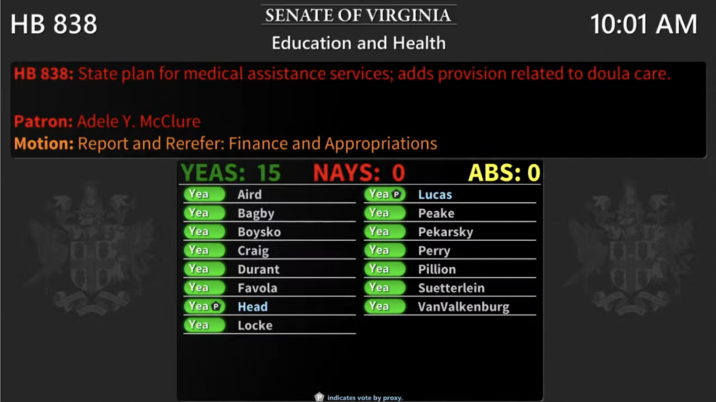 Later Tuesday afternoon, I also presented HB838 to the Health subcommittee of the Senate Education and Health committee. HB838 would give the Department of Medical Assistance Services (DMAS) the authority to update the existing state plan to add in language from the bill I carried last year (HB1614) to include payments for doula services. This technical change ensures that those covered by Medicaid will have access to additional postpartum visits. This bill was reported from the full Senate Education and Health committee and now heads to Senate Finance and Appropriations.
