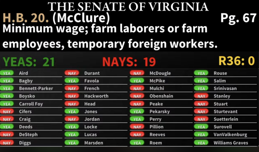 HB20 would finally provide our farmworkers with long-overdue minimum wage protections by removing the farmworker exemption from the Virginia Minimum Wage Act. I have carried this bill since 2024, and before me, Chairwoman Jeion Ward carried it. It is my hope that after so many years of fighting, this shameful Jim Crow relic will finally be removed from the Code of Virginia. This bill passed the Senate with a vote of 21-19.