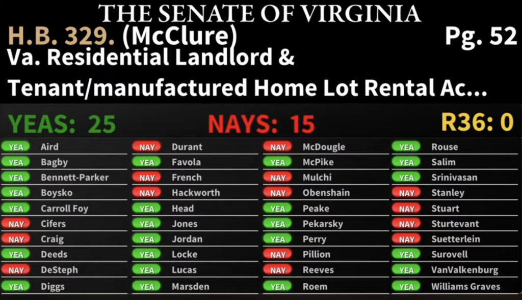 HB329 would strengthen protections for tenants facing landlord retaliation by expanding the definition of retaliatory acts to include harassment. It is my hope that this bill will give tenants across Virginia a voice without fear of harassment or retaliation from their landlord. This bill passed the Senate with a vote of 25-15.