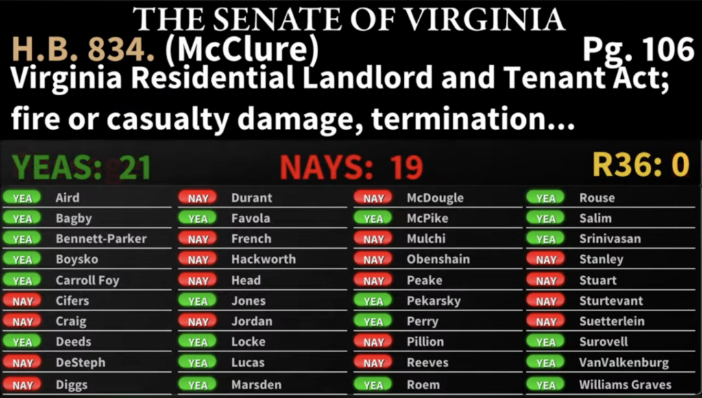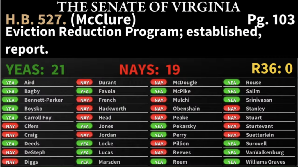 Other pivotal legislation includes SB181, carried by Senator Williams Graves, which addresses the current housing crisis by increasing the affordable housing supply in Virginia. HB281, carried by Delegate Callsen, would finally allow judges to consider evidence of a landlord’s failure to keep the home livable as a defense to eviction. HB174, carried by Delegate Feggans, protects our military tenants by removing the requirement that military personnel must provide a 60 day notice to terminate a rental agreement.
