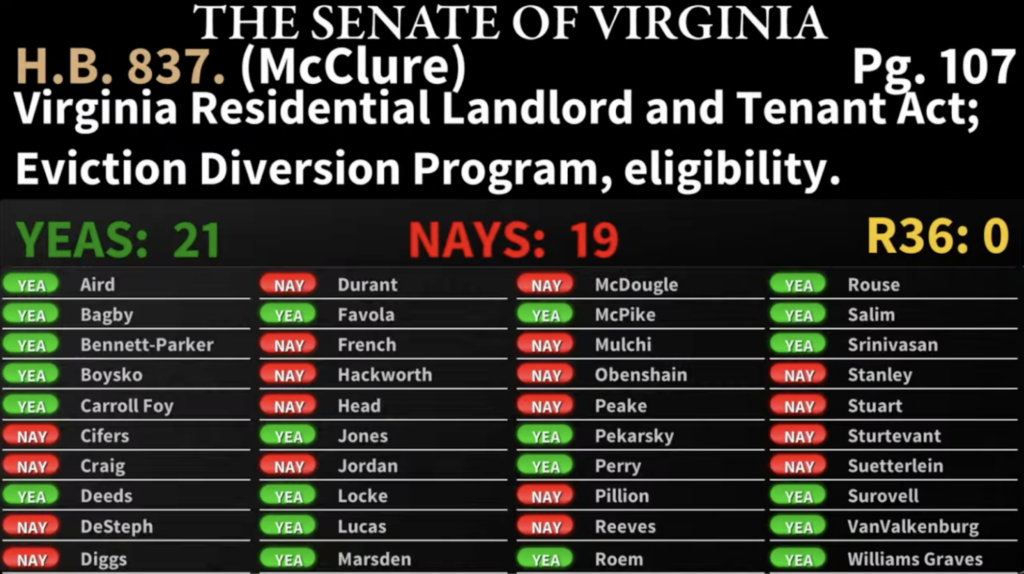 HB837 would broaden the eligibility for the Eviction Diversion Court Program, lowering initial cost barriers and removing overly strict late-payment disqualifications. This bill passed the Senate with a vote of 21-19.